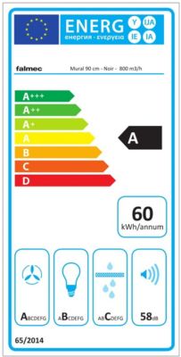 Consommation d'énergie Classe d'efficacité énergétique: A, Consommation annuelle d'énergie en kWh: 60 kWh, Classe d'efficacité d'évacuation de la vapeur et fumées: A, Classe d'efficacité de l'éclairage: B, Classe d'efficacité de filtration des graisses: C