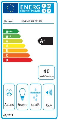 Consommation d'énergie Classe d'efficacité énergétique: A+, Consommation annuelle d'énergie en kWh: 40 kWh, Classe d'efficacité d'évacuation de la vapeur et fumées: A, Classe d'efficacité de l'éclairage: A, Classe d'efficacité de filtration des graisses: F