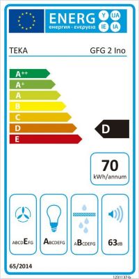 Consommation d'énergie Classe d'efficacité énergétique: D, Consommation annuelle d'énergie en kWh: 70 kWh, Classe d'efficacité d'évacuation de la vapeur et fumées: E, Classe d'efficacité de l'éclairage: A, Classe d'efficacité de filtration des graisses: B